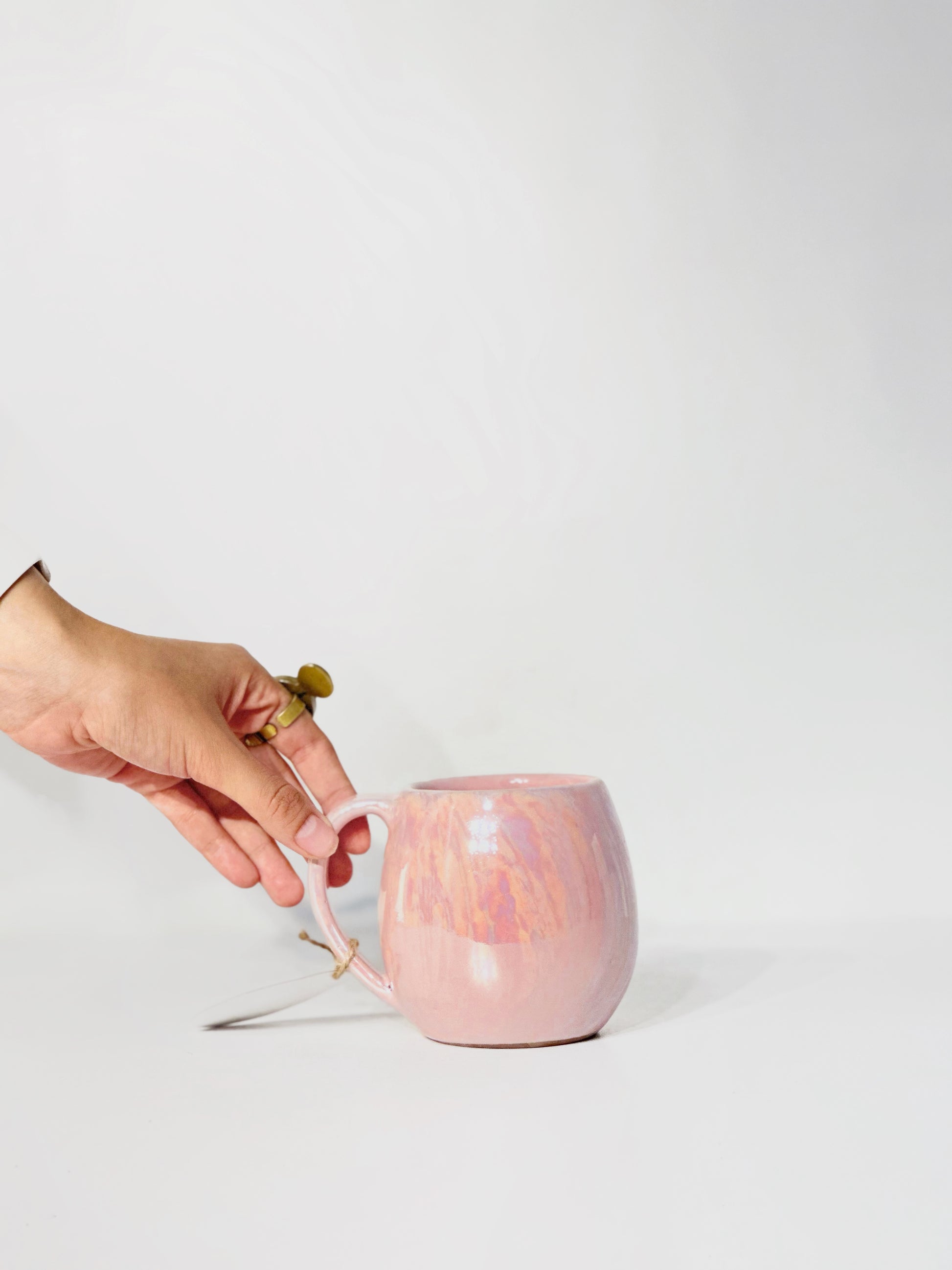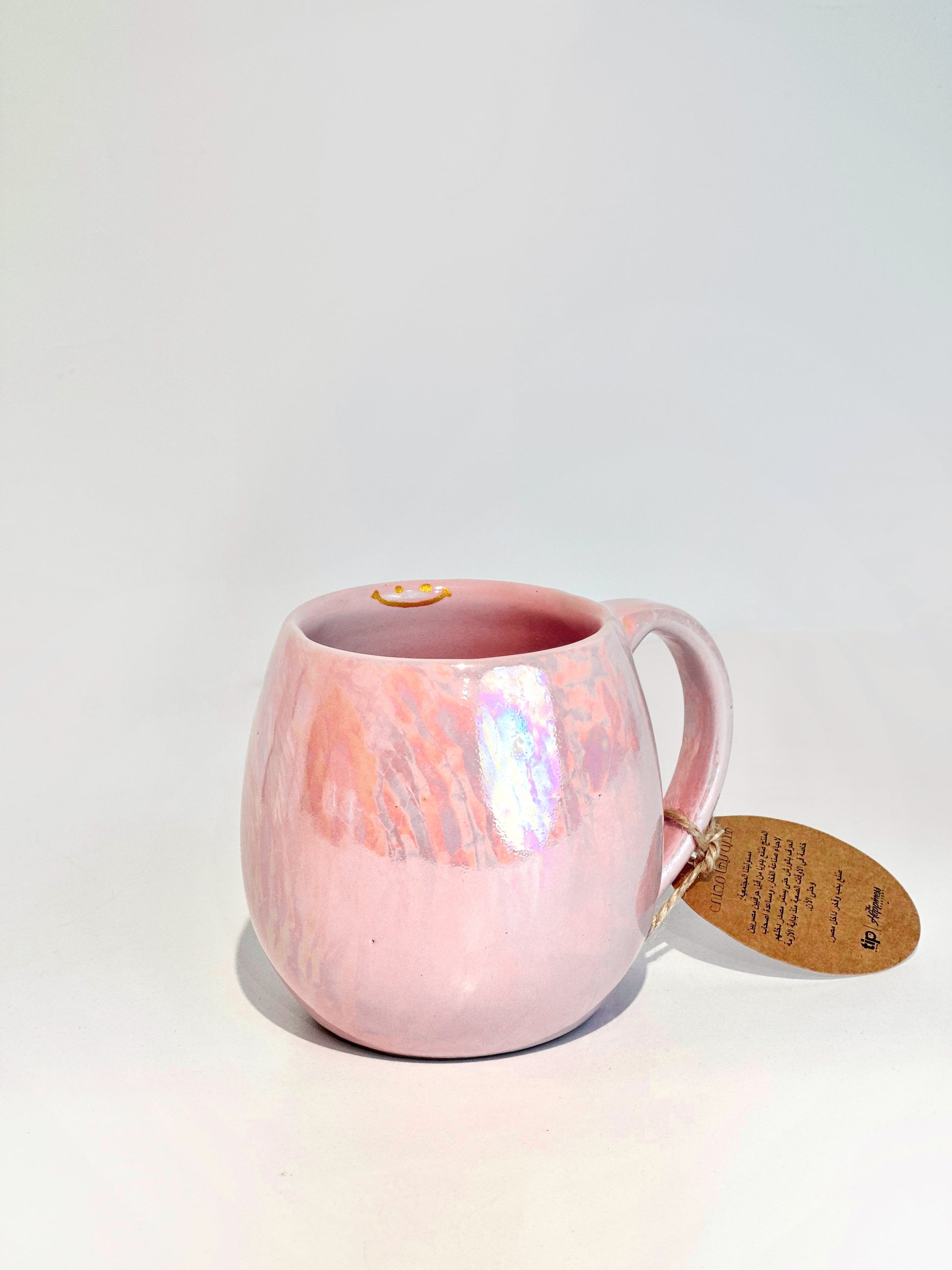 مـج جديد باللون الوردي الممزوج بألوان الطيف ليضيف شعور بالسعادة والبهجة والحيوية لجميع أوقاتك. مع كل رشفة هناك وجه يبتسم لك مرسوم على حافة المج من الداخل باللون المدهب. هدية لك ولأصدقائك وأحبابك، لجميع المناسبات.